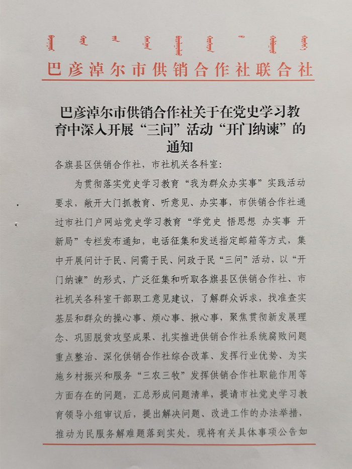 巴彦淖尔市供销合作社关于在党史学习教育中深入开展“三问”活动“开门纳谏”的通知